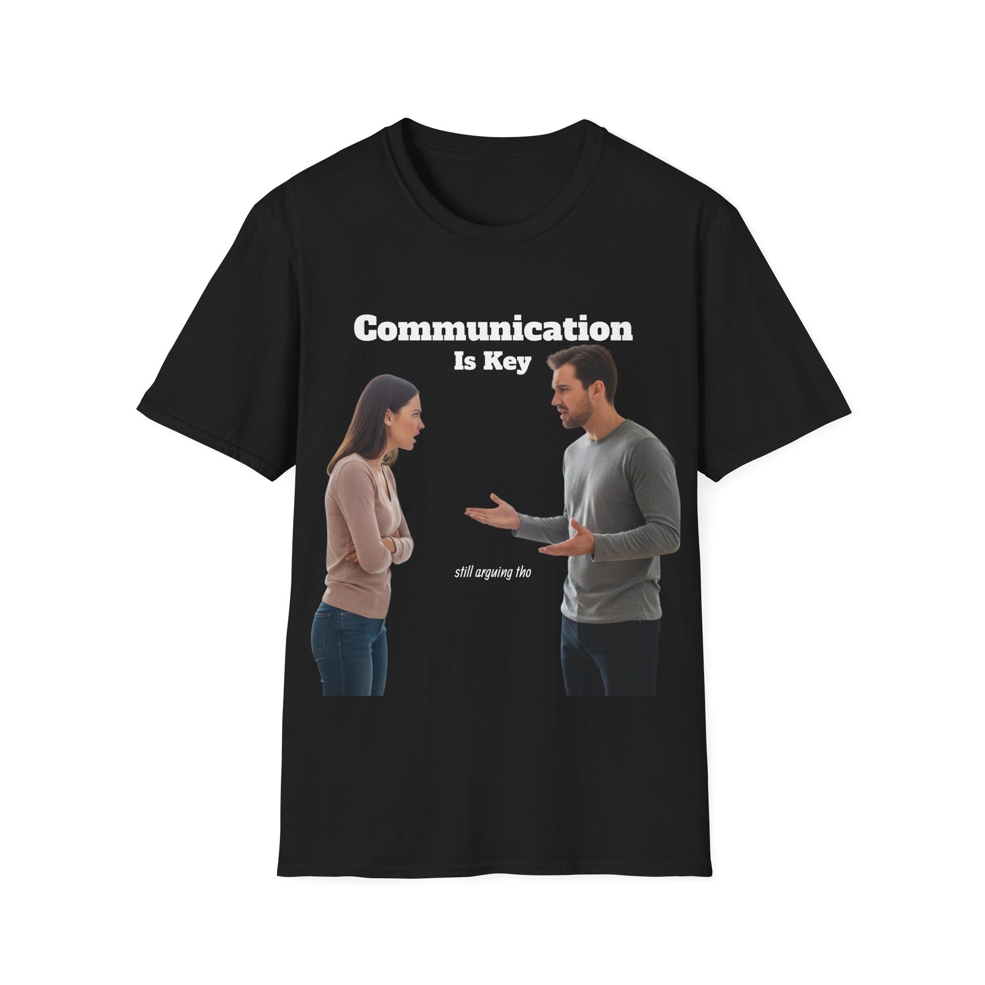 This tee speaks plainly and honestly about what matters in close relationships. A soft, lightweight cotton shirt with a bold front print showing two people in conversation and the phrase “Communication Is Key” — it’s for the person who values clear talk and emotional honesty. Wear it to start conversations, lighten tense moments, or remind a partner or friend that listening matters. The shirt’s clean black backdrop keeps the image front-and-center while the comfortable crew neckline and classic fit make it easy to pair with jeans or lounge wear. Subtle but direct, it turns a simple gesture into a visible statement about openness and connection.